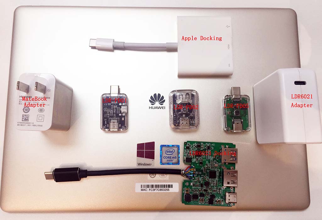 如圖1所示,本次測試使用了7款TYPE-C外設(shè)。包括,第一、Matebook原配24W適配器;第二、Apple 官方Macbook Docking;第三、LDR6021 60W適配器;第四、LDR-PD01 USB PD協(xié)議分析儀;第五、LDR-PD02 USB PD電壓觸發(fā)器;第六、LDR-PD05 TYPE-C接口雙向保護器;第七、LDR6023 DOCKING,帶HDMI輸出。