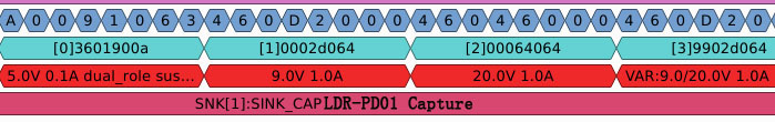 插入以后,LDR-PD01立即收到了適配器與Matebook之間的通信協(xié)議,首先來看適配器發(fā)出的PDO。
