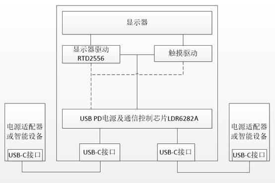 本方案適用于雙USB Type-C接口的便攜顯示器項(xiàng)目。其中兩個(gè)USB Type-C接口在功能上是對(duì)等的,它們既可以接適配器,也可以接投屏設(shè)備,但同一時(shí)刻,系統(tǒng)只能接一個(gè)適配器和一個(gè)投屏設(shè)備,不考慮同時(shí)接兩個(gè)適配器和兩個(gè)投屏設(shè)備的非常規(guī)情況。由于兩個(gè)C口的電壓是一樣的,且由投屏設(shè)備請(qǐng)求決定,所以系統(tǒng)輸入功率會(huì)根據(jù)所接的設(shè)備不同而不同,因此本方案非常適用于普通功率的顯示器和轉(zhuǎn)接器,如1080P、2K分辨率等功率要求一般的便攜顯示器。LDR6282A功能框圖如下:
