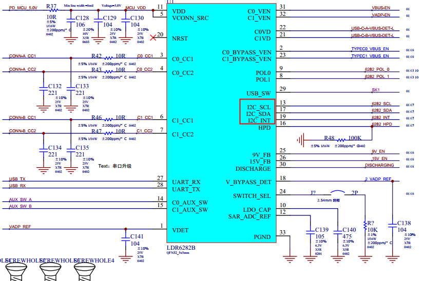 3K/4K 雙USB Type-C接口盲插便攜顯示器解決方案LDR6282B部分電路如下: