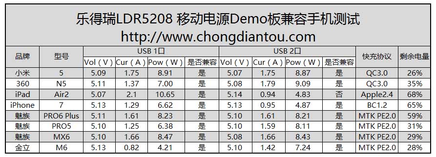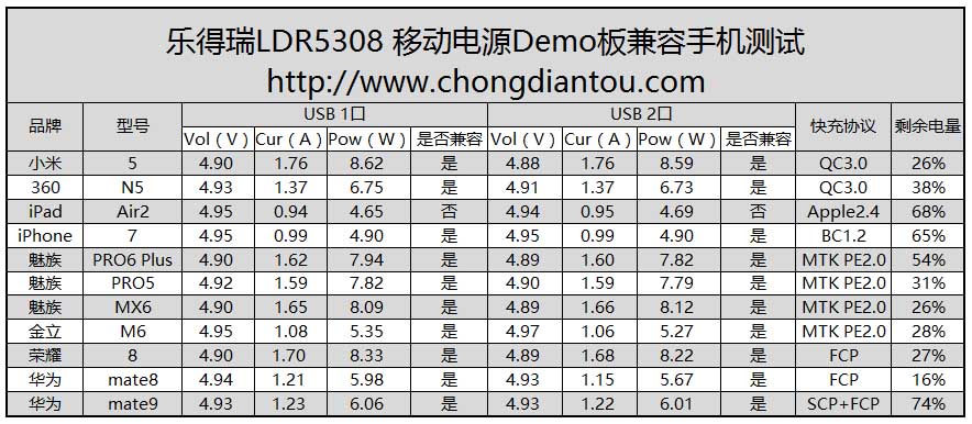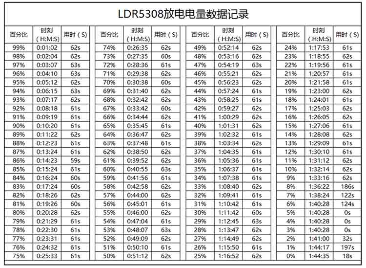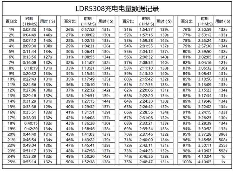 移動電源電量的精準(zhǔn)顯示以LDR5308為例,無論是充電還是放電,均能準(zhǔn)確的獲取電池電量信息,如下表: