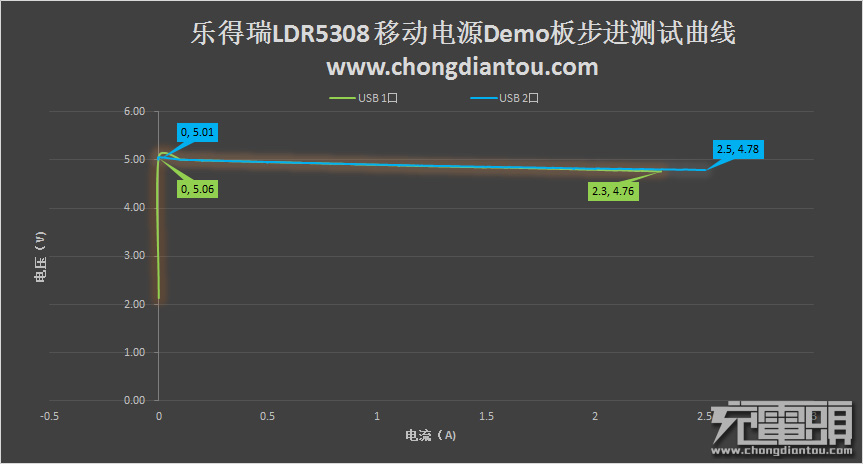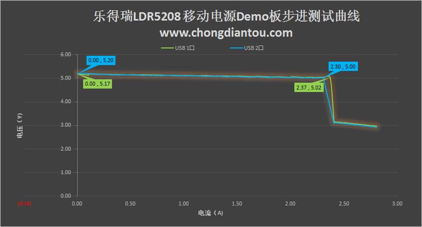 兩個USB-A口(設(shè)遠(yuǎn)離LED燈的輸出口為USB 1口)分別步進測試,步進趨勢相近。5V恒壓輸出,最大步進電流可達2.3A。