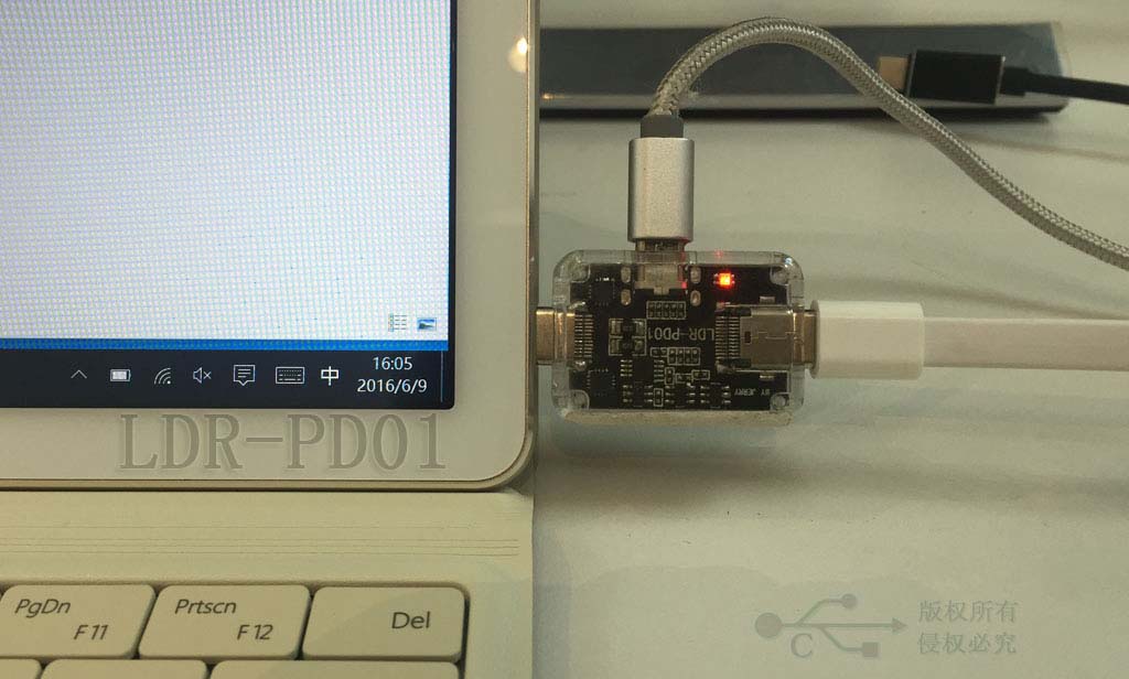 如圖1所示,本次測試使用了7款TYPE-C外設(shè)。包括,第一、Matebook原配24W適配器;第二、Apple 官方Macbook Docking;第三、LDR6021 60W適配器;第四、LDR-PD01 USB PD協(xié)議分析儀;第五、LDR-PD02 USB PD電壓觸發(fā)器;第六、LDR-PD05 TYPE-C接口雙向保護器;第七、LDR6023 DOCKING,帶HDMI輸出。