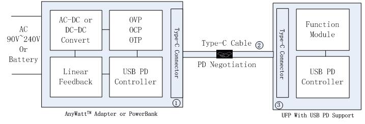 AnyWatt?技術(shù)方案的核心,是允許用電器對(duì)配電器進(jìn)行編程,讓配電器輸出最適合用電器實(shí)時(shí)需要的電流和電壓。這種編程行為,可以快速而動(dòng)態(tài)的進(jìn)行,實(shí)現(xiàn)實(shí)時(shí)智能供電。因此,AnyWatt是PPS(Programmable power supply)的一種實(shí)現(xiàn)方式,基于USB PD標(biāo)準(zhǔn)協(xié)議,無(wú)需使用VDM(Vendor Define Message)。完全兼容USB PD2.0/USB PD3.0以及未來更高級(jí)的向下兼容的USB PD版本。