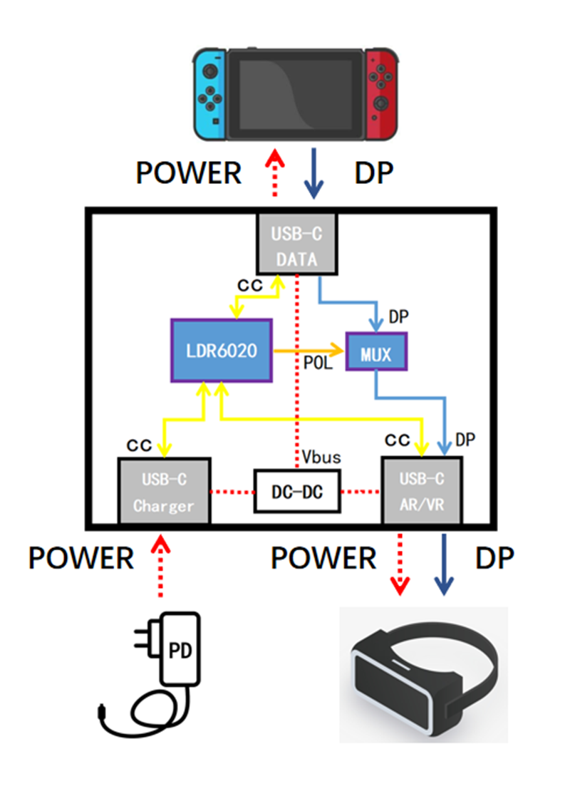 針對(duì)VR眼鏡的應(yīng)用場景,樂得瑞科技推出基于LDR6020的單芯片3路CC管理VR轉(zhuǎn)接器解決方案,特別適用于Switch游戲機(jī)投屏到VR頭顯,因?yàn)?/span>Switch游戲機(jī)并不能直接連接VR頭顯使用,投屏的條件就是必須接適配器,LDR6020可以很好的協(xié)商三者的供電需求并且讓Switch游戲機(jī)進(jìn)行投屏。